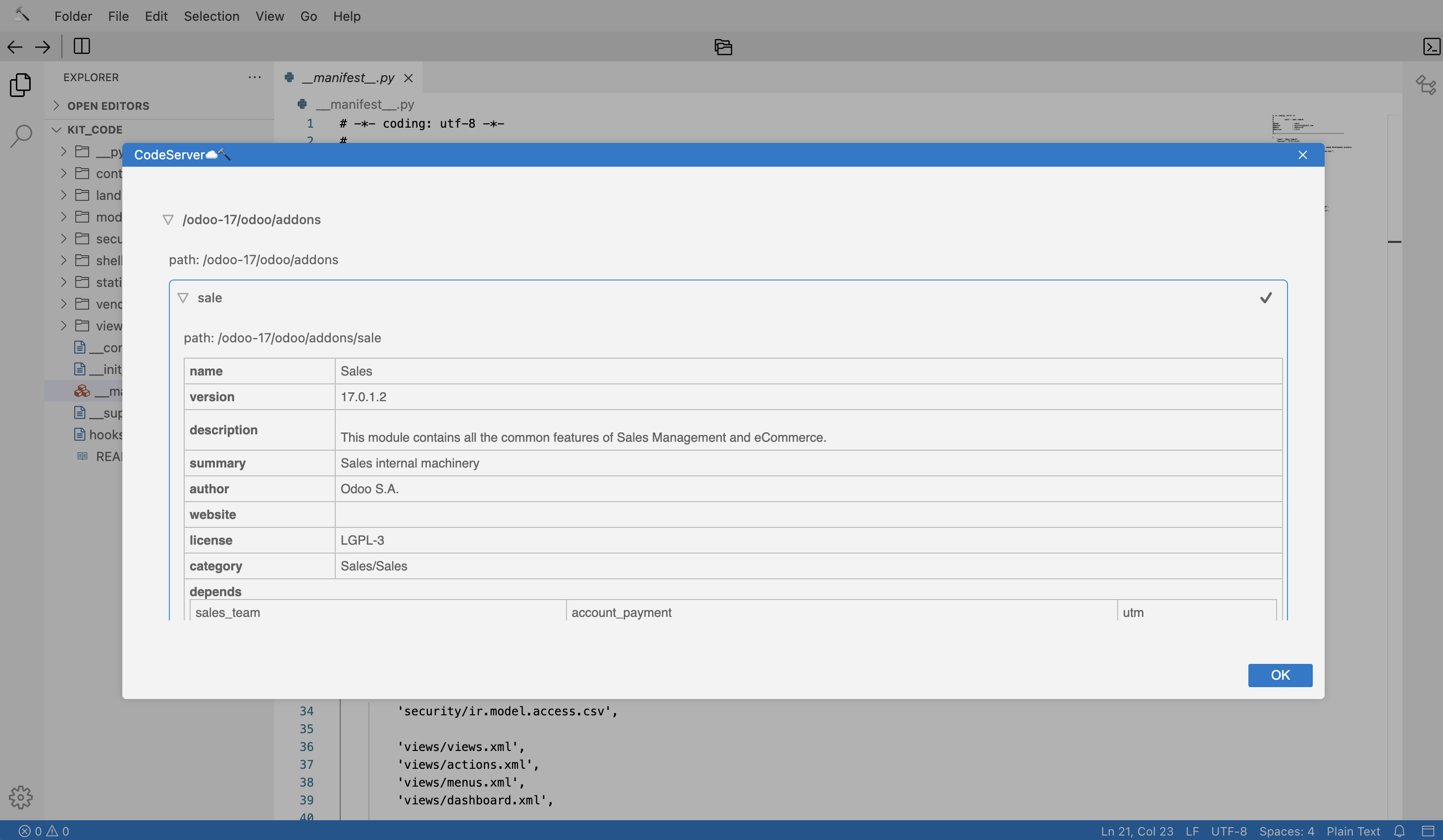 Launch Code Server, browse Odoo modules source code online.